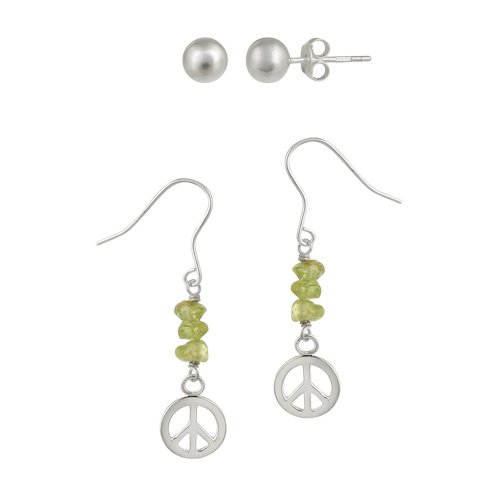 Sterling Silver Peace Sign and Peridot Chip Linear French Wire Earrings and 6mm Stud Earrings Set Feature